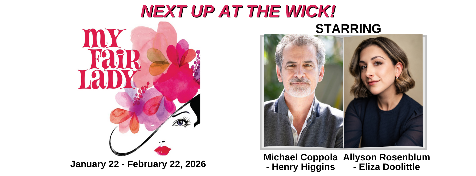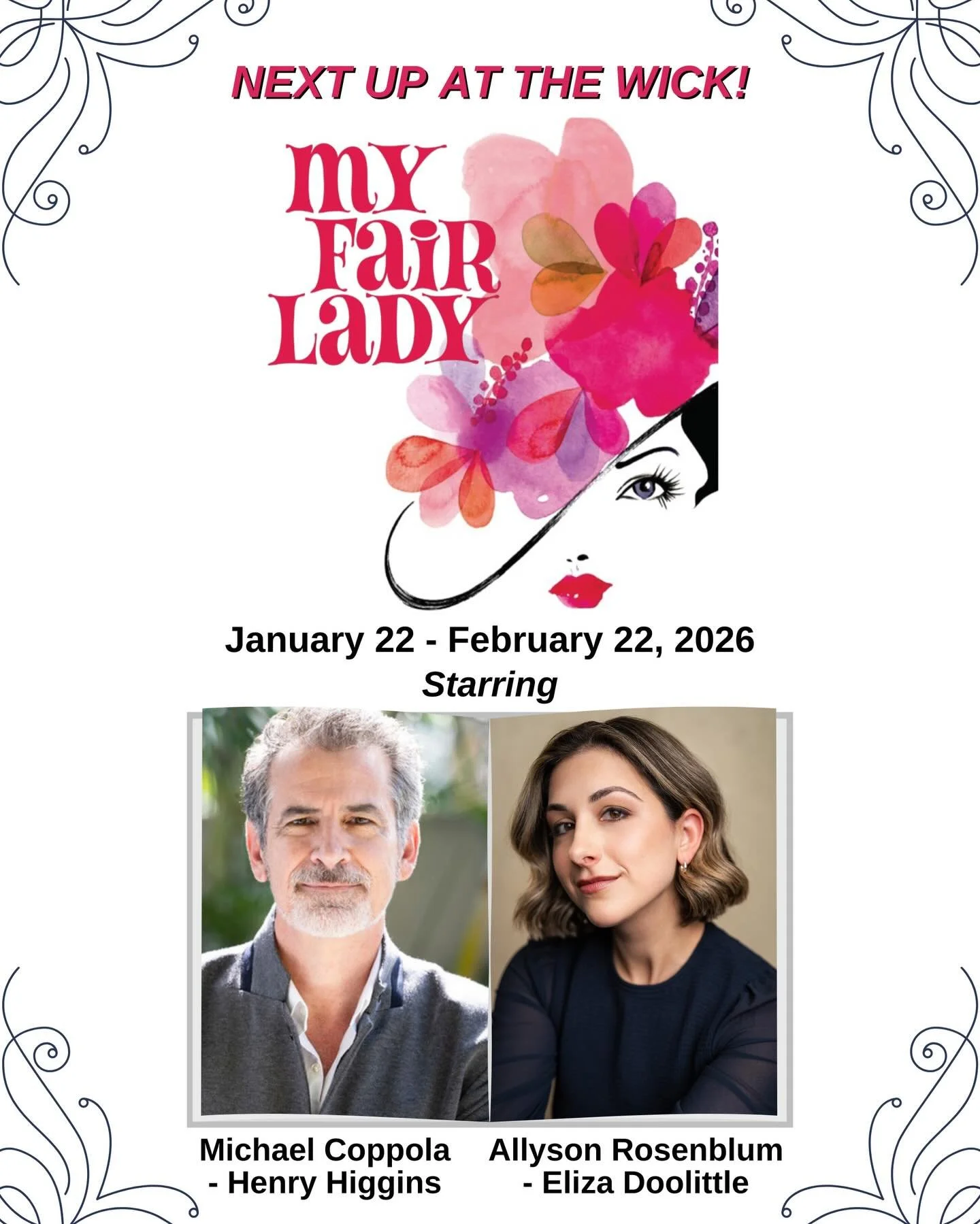 My Fair Lady, based on George Bernard Shaw’s Pygmalion, follows Eliza Doolittle, a spirited Cockney flower girl, as she’s molded into a refined lady by the brilliant—and exasperating—Professor Henry Higgins. Starring Michael Coppola as Henry Higgins and Allyson Rosenblum as Eliza Doolittle, this beloved classic sparkles with Lerner and Loewe favorites including “Wouldn’t It Be Loverly?” and “I Could Have Danced All Night.” Charming, elegant, and endlessly entertaining, My Fair Lady remains a gold standard of musical theatre.